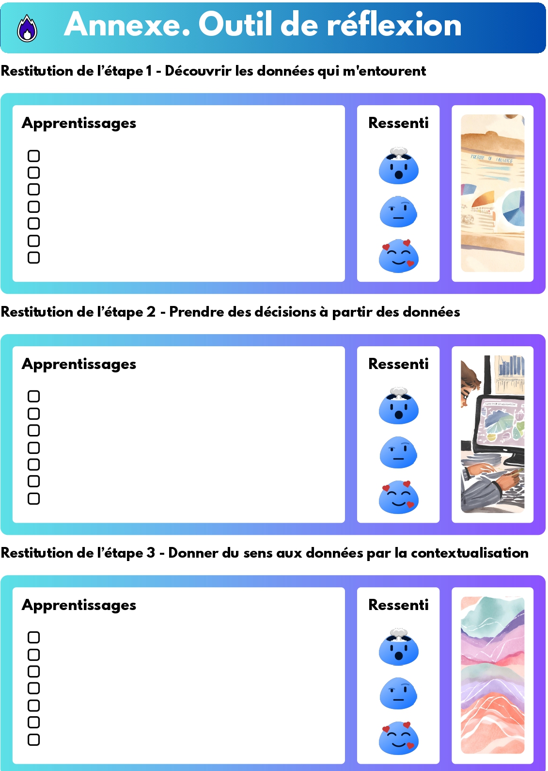 - Étape 3 : 1 élément d'information complémentaire par groupe à imprimer, 1 modèle « Data Storytelling » par groupe