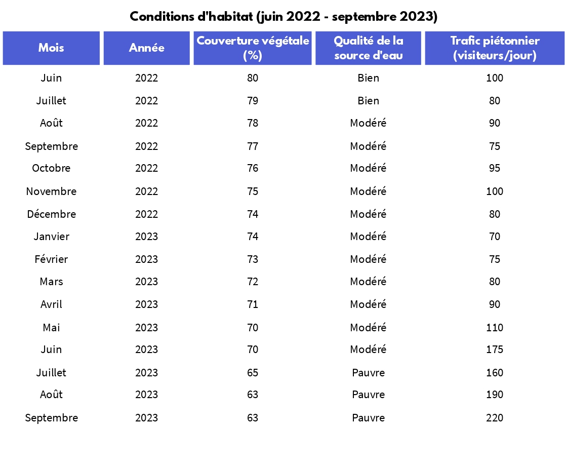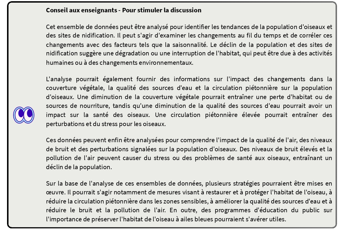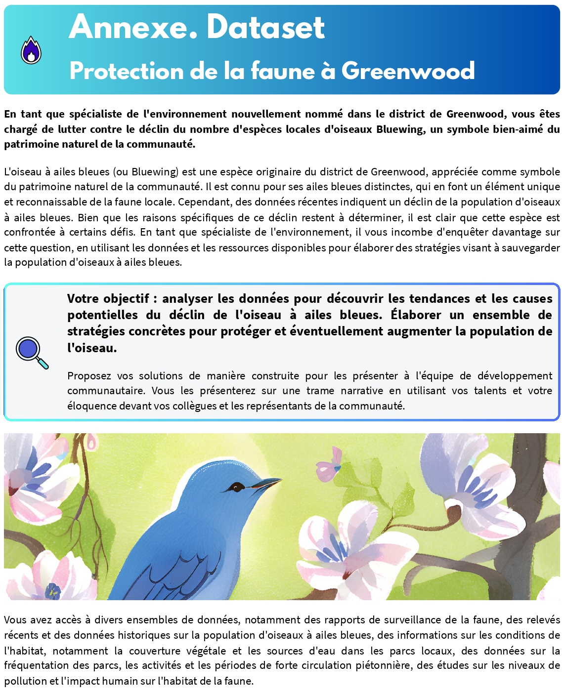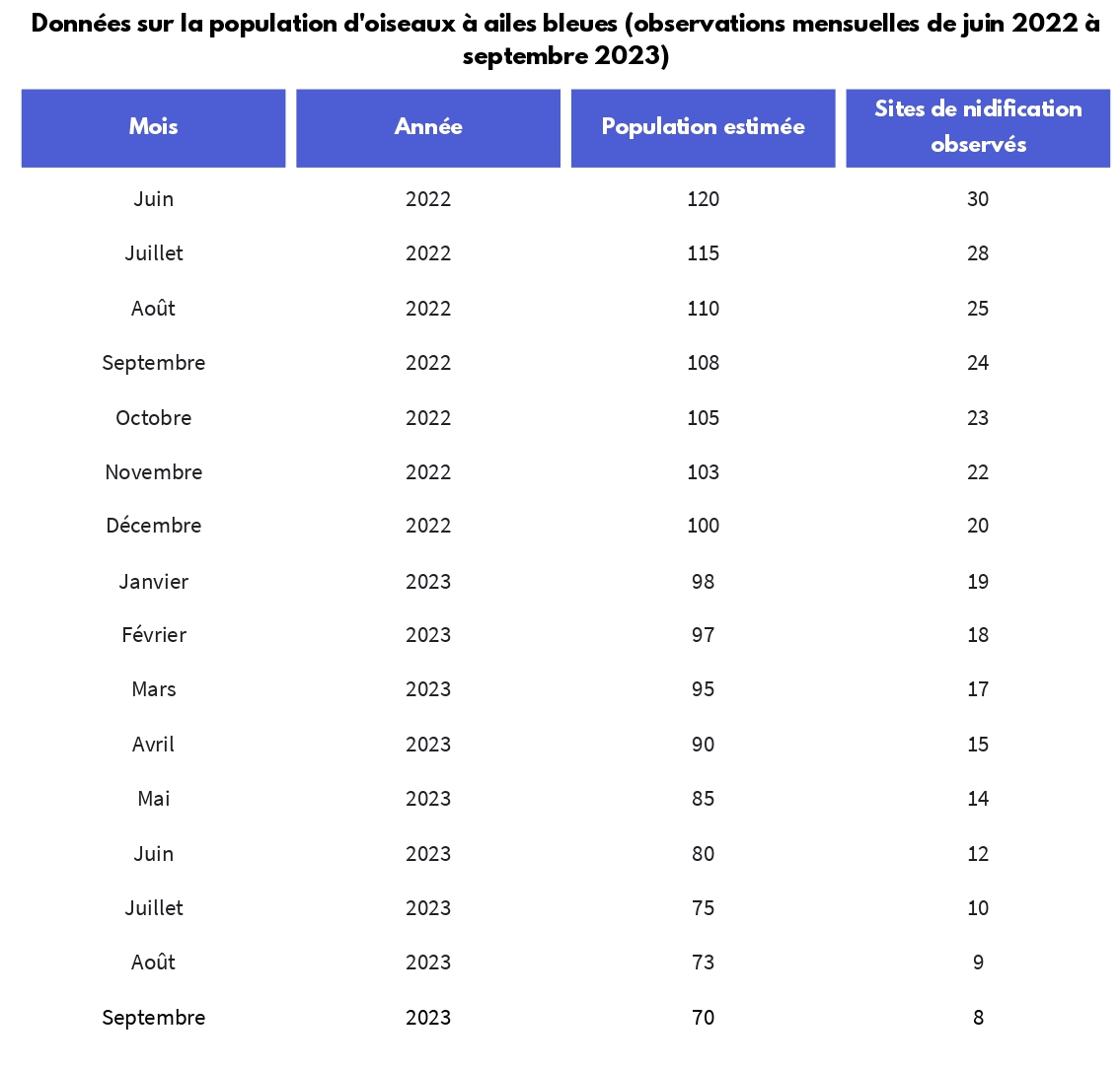 | Protection de la faune à Greenwood | Engagement, transparence, coordination des services | Expert environnemental. Mission : découvrir les tendances et les causes potentielles du déclin de l'oiseau à ailes bleues | Population d'oiseaux à ailes bleues, conditions d'habitat, pollution et impact humain |