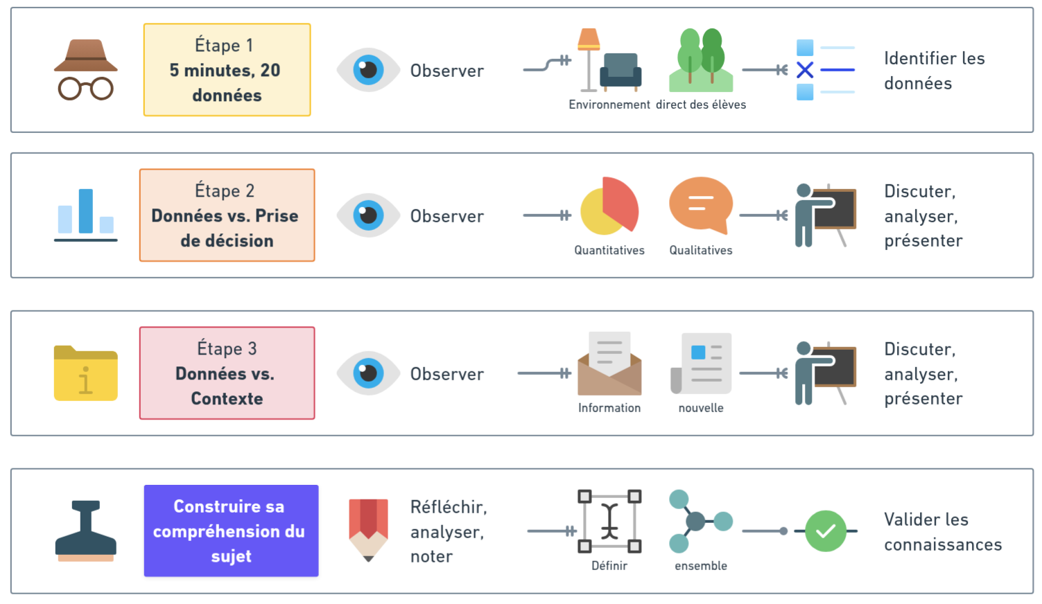 Le protocole Données vs. Contexte vise à expliciter auprès des élèves les concepts de données, d'informations et de connaissances, et la façon dont elles diffèrent. Il leur offre un cadre pour aborder comment le contexte joue un rôle crucial dans l'investigation d'un système, d'un concept ou d'une question complexe.
