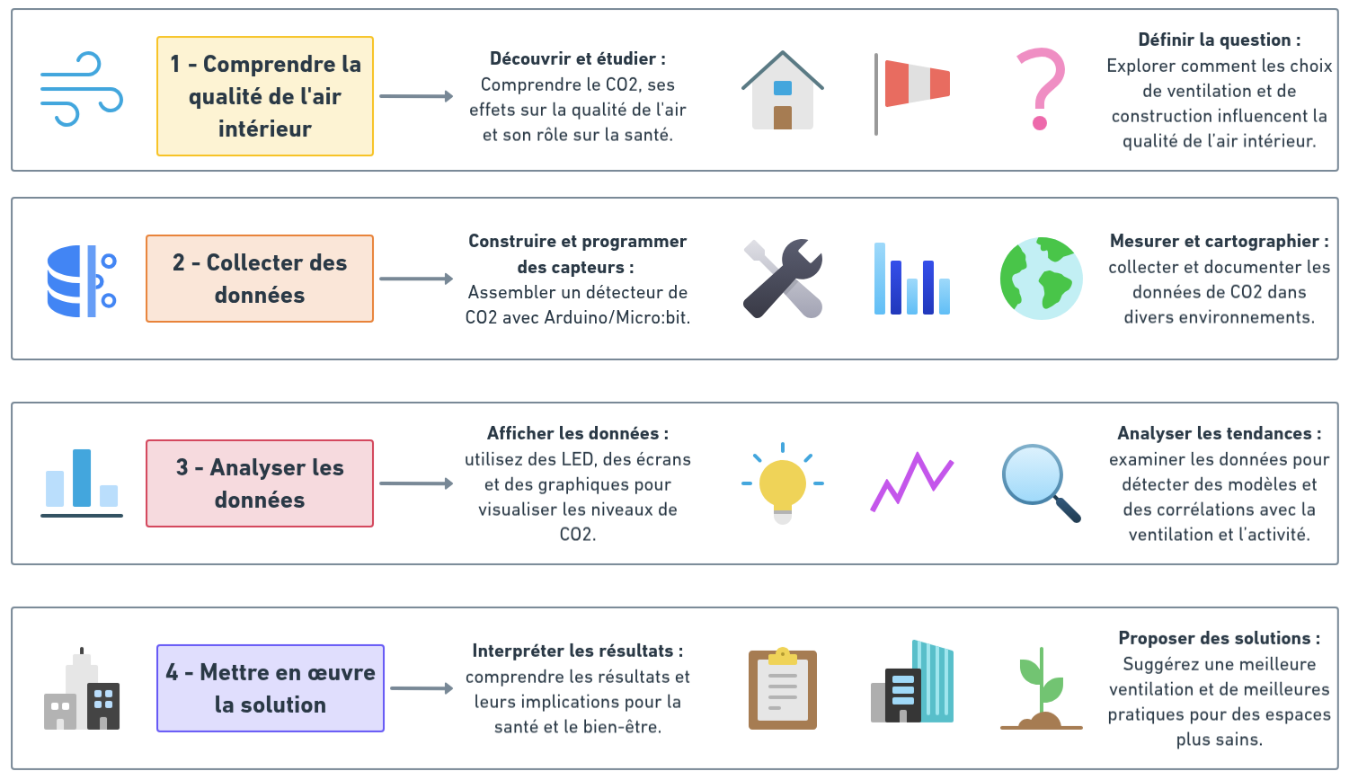 L'objectif de cette phase est d'apprendre à collecter des données à l'aide de la programmation et de capteurs (CO2). Il est primordial de procéder étape par étape, en demandant aux élèves quels sont les fondamentaux (l'impact d'un niveau trop élevé de dioxyde de carbone sur l'homme), puis en déterminant les seuils de données à collecter.