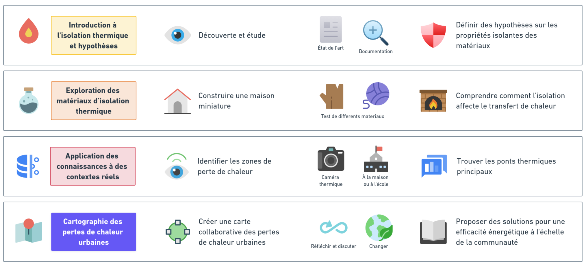 Phase 4 — cartographie collaborative des pertes de chaleur urbaines. Les élèves élargissent leur démarche à l'échelle du quartier ou de la ville. Ils mènent une « marche thermique » équipée de caméras thermiques, afin de collecter des données sur les déperditions de chaleur de plusieurs bâtiments. Ces observations sont ensuite utilisées pour créer une carte collaborative des pertes thermiques urbaines. Cette étape replace leur travail dans un cadre collectif et citoyen, et conduit à proposer des pistes concrètes d'amélioration de l'efficacité énergétique à l'échelle de la communauté.