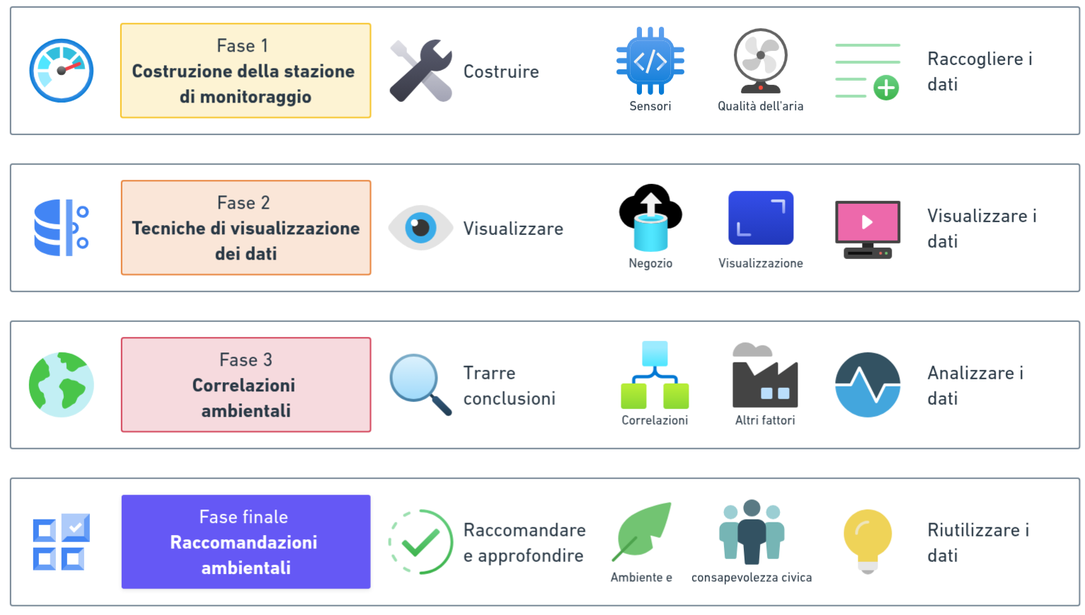 - Phase 1 : Collecter des données, construction et déploiement de capteurs — Les élèves construisent leur station de surveillance de la qualité de l'air et apprennent à collecter des mesures à l'aide de capteurs. Cette première phase présente les composants et concepts techniques tout en générant les données brutes nécessaires à l'analyse ultérieure.