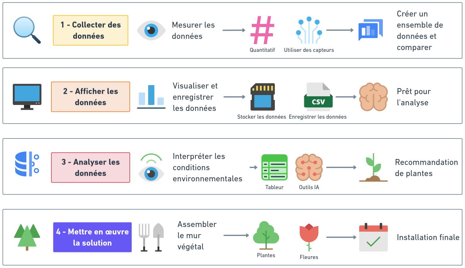Le protocole se déroule en quatre phases successives, qui mènent les élèves de la caractérisation scientifique d'un site jusqu'à la réalisation concrète d'un mur végétal connecté.