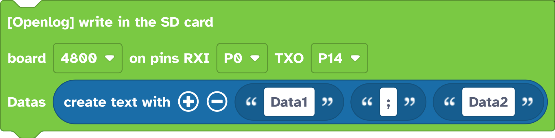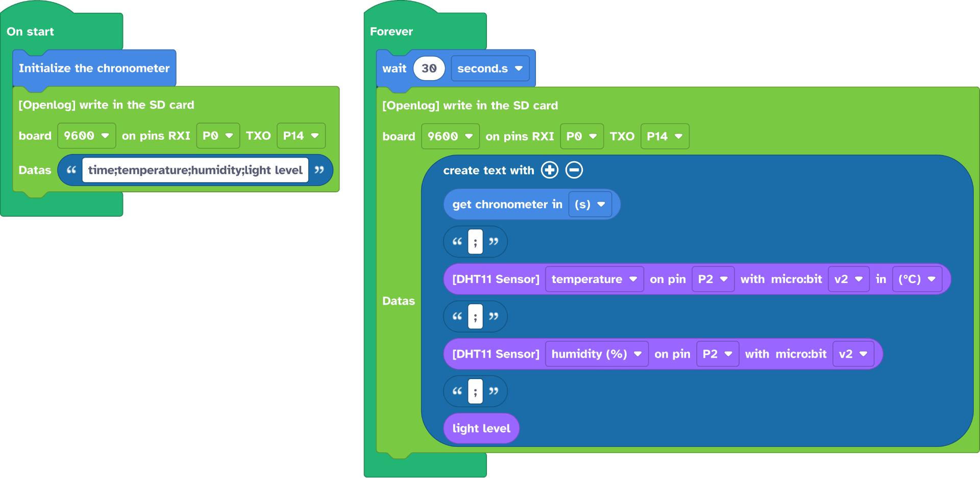 Dans le programme, il faut écrire sur la carte SD les en-têtes de colonnes, puis les données. L'écriture se fait à l'aide d'un bloc dédié de la catégorie communication. En plus de la température, de l'humidité et de la luminosité, il est intéressant de noter le temps correspondant à chaque mesure : des blocs spécifiques permettent respectivement de démarrer un chronomètre et de récupérer sa valeur.
