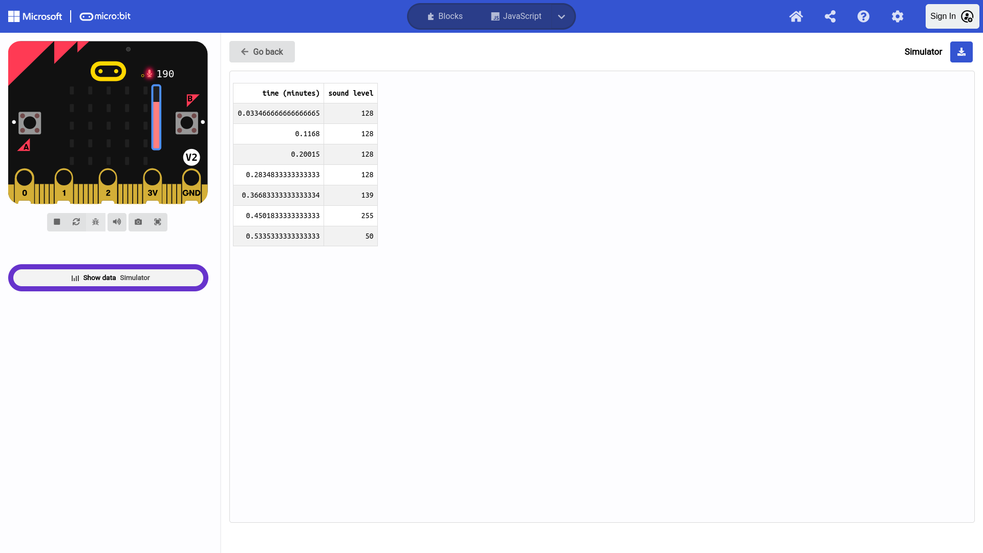 Organisez les blocs en suivant le code ci-dessous (boucle infinie, enregistrement dans le datalogger…) ou copiez-collez directement le code dans l'éditeur JavaScript. Testez dans le simulateur de MakeCode.