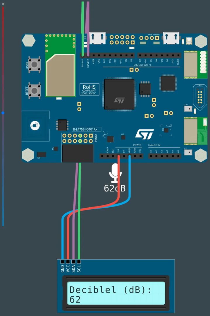 Cette fiche technique accompagne la ressource Whisper Walls. La carte STM32 IoT Node Discovery intègre un microphone qui renvoie une valeur en décibels. On l'utilise d'abord dans la console série pour visualiser les mesures, puis on les affiche en temps réel sur un écran LCD I2C.