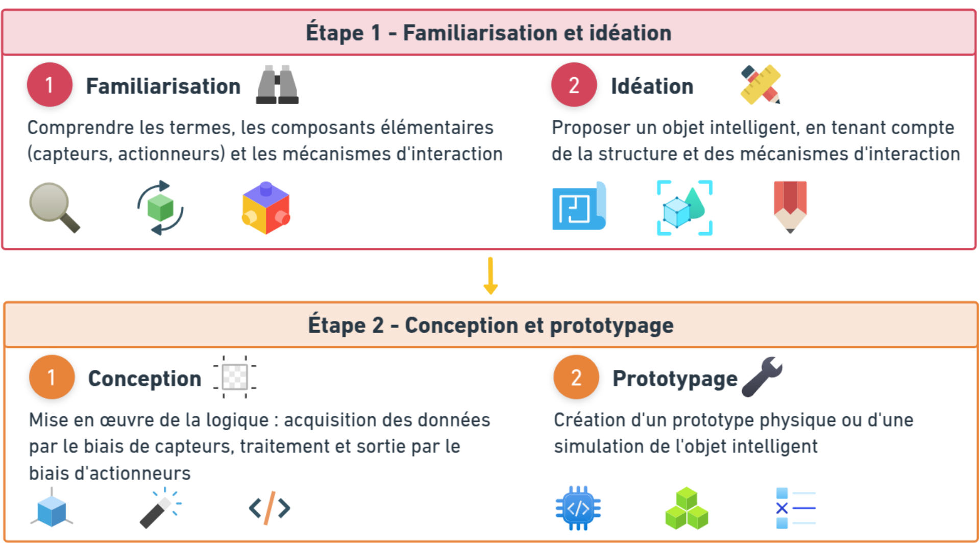 - Phase 1 : Familiarisation et idéation. Les participants se familiarisent avec les concepts fondamentaux et proposent une idée de l'objet qu'ils souhaitent concevoir.