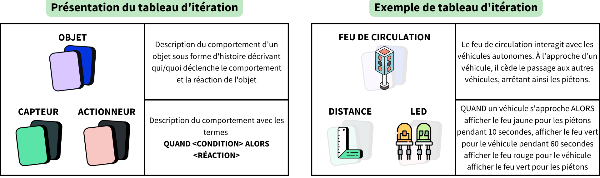 | Capteur / Actionneur | Description avec QUAND <CONDITION> ALORS <RÉACTION> | Distance / LED : QUAND un véhicule s'approche ALORS afficher le feu jaune pendant 10 secondes, puis le feu vert pendant 60 secondes |