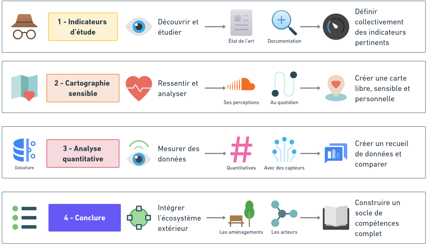 - Phase 1 — Compréhension de la problématique et définition des indicateurs : les élèves découvrent la problématique du bruit urbain et son impact sur la qualité de vie. Ils élaborent collectivement des indicateurs (intensité perçue, fréquence, type de source, impact sur le bien-être) qui formeront la base du cadre d'analyse.