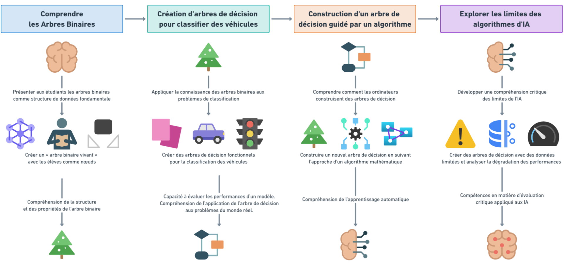 - Phase 1 : Comprendre les arbres binaires. Les élèves découvriront le concept d'arbres binaires, une structure de données largement utilisée dans le domaine de l'apprentissage supervisé.