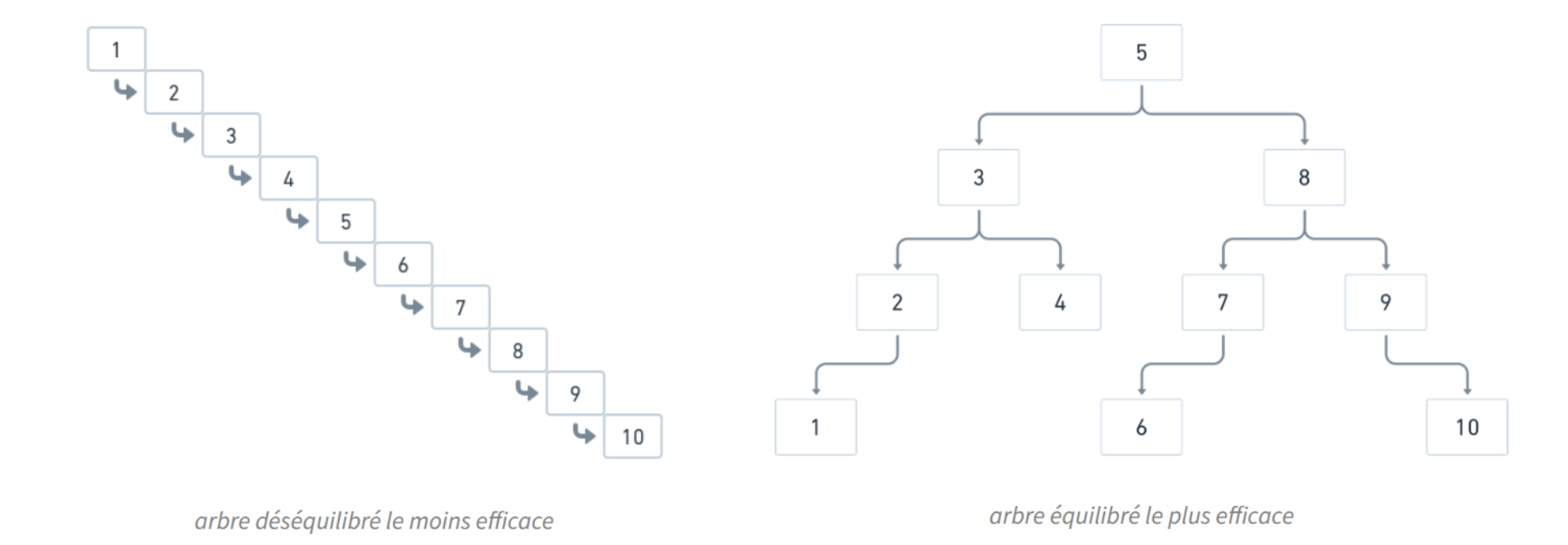 L'arbre le moins efficace est celui qui ne contient qu'une seule branche, où les nombres sont classés par ordre (arbre déséquilibré). En revanche, l'arbre le plus efficace est complètement équilibré, c'est-à-dire que toutes les branches de l'arbre ont la même longueur (plus ou moins 1).