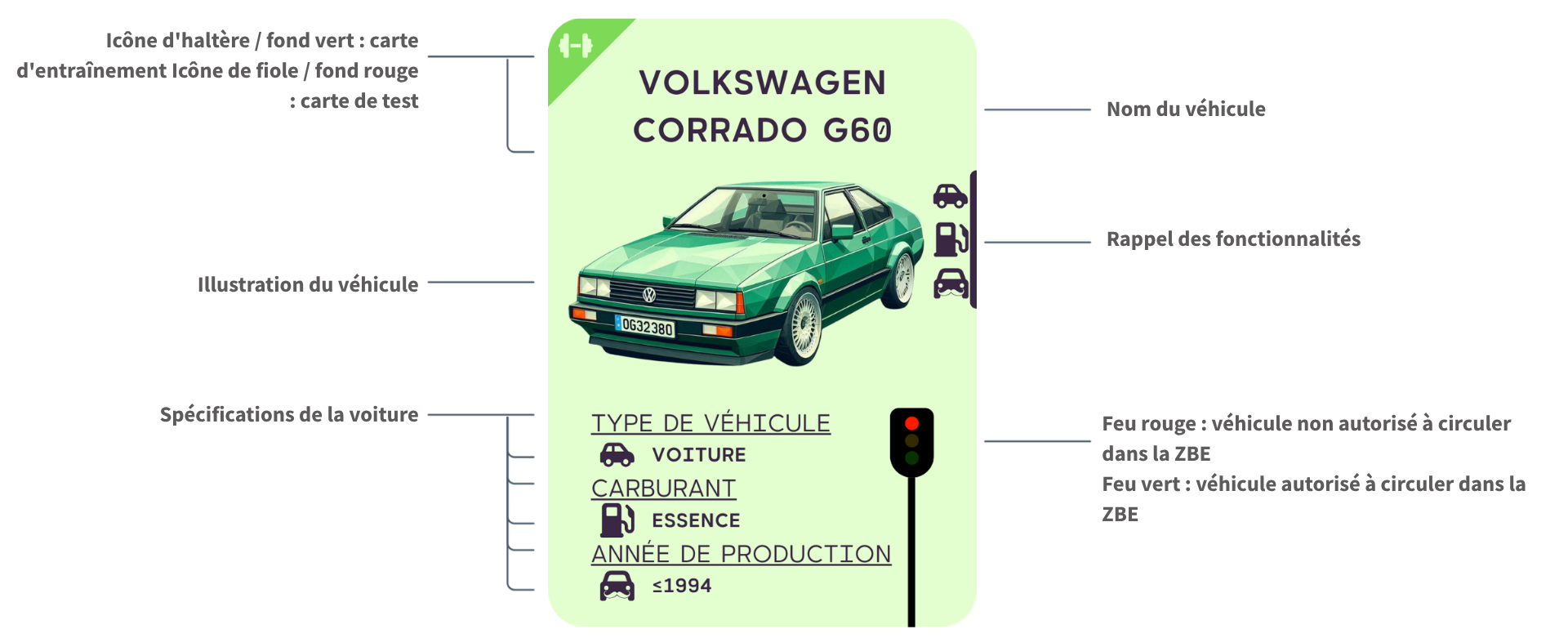 Au cours de cette phase, les élèves devront se familiariser avec un jeu de données, représenté par le jeu de cartes de véhicules. Description des éléments visuels des cartes :