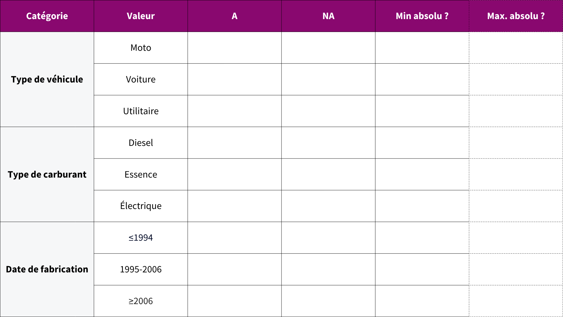 - Remplir les colonnes A et NA (véhicules autorisés et non autorisés) pour chaque valeur de chaque catégorie.