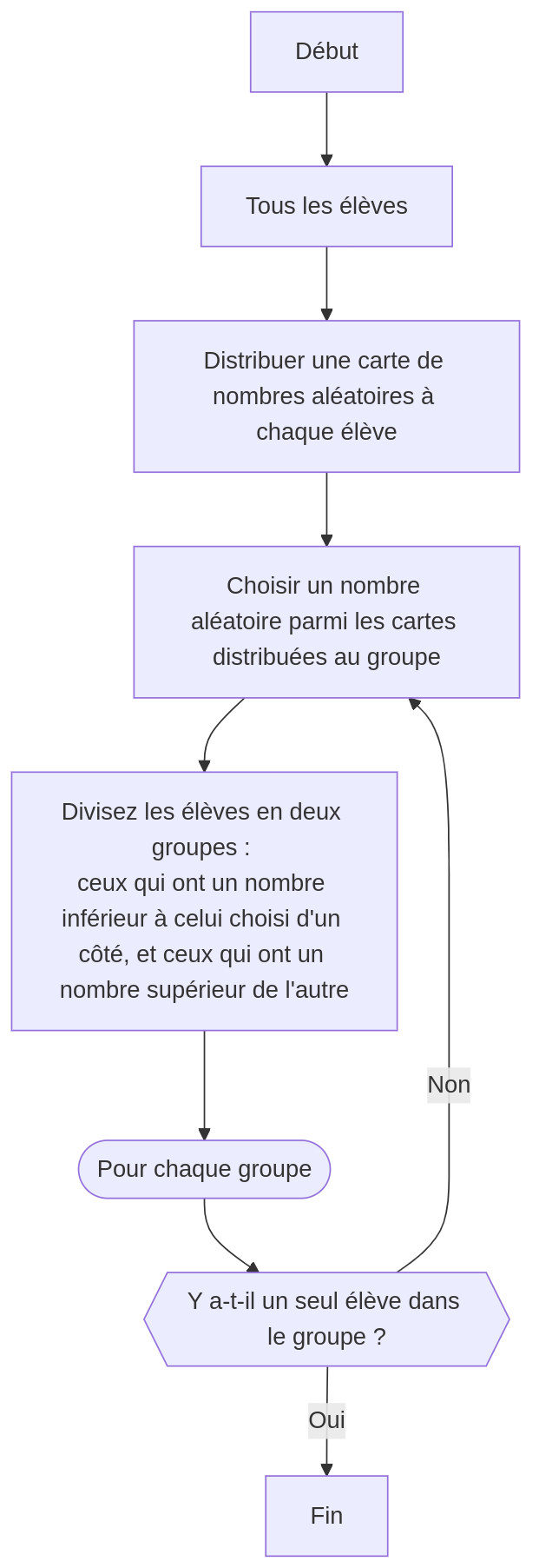 Pour commencer, chaque élève reçoit une carte numérotée aléatoirement entre 1 et le nombre d'élèves (vous pouvez utiliser les cartes numérotées en annexe, ou simplement utiliser des morceaux de papier numérotés).