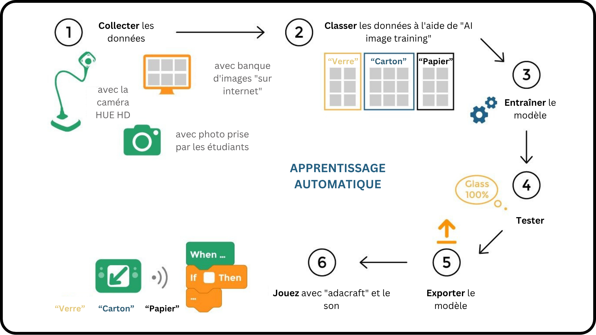 Dans ce protocole, les élèves développeront un système de tri des déchets basé sur l'IA et utilisant la vision par ordinateur. Par l'expérimentation et l'apprentissage, ils créeront un programme capable d'identifier différents types de matériaux recyclables à l'aide d'une caméra. Le projet se déroule en quatre phases : collecte de données, apprentissage du modèle, tests et mise en œuvre. Au cours de ces phases, les élèves collecteront et organiseront des images de déchets, entraîneront un modèle d'IA à reconnaître différents matériaux, testeront sa précision et enfin le connecteront à du matériel physique. Cette progression leur permettra de comprendre les fondements théoriques et les applications pratiques des systèmes d'IA. Cette approche pratique aide les élèves à développer des connaissances clés dans deux domaines cruciaux :