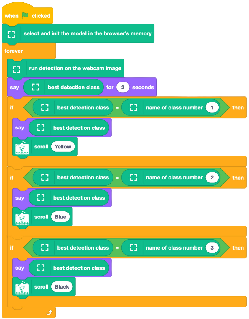 Cette dernière phase permet aux élèves d'approfondir leurs compétences en programmation grâce à des outils (interfaces et matériel). Elle peut être réalisée en classe. Créez un programme qui exécute une action chaque fois que le modèle d'IA entraîné effectue une prédiction.