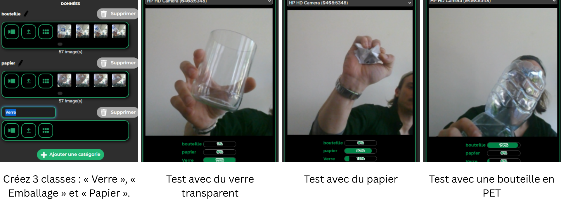 Vous devez donc créer 3 dossiers : « Verre », « Emballage » et « Papier » dans lesquels placer les images que vous allez capturer.