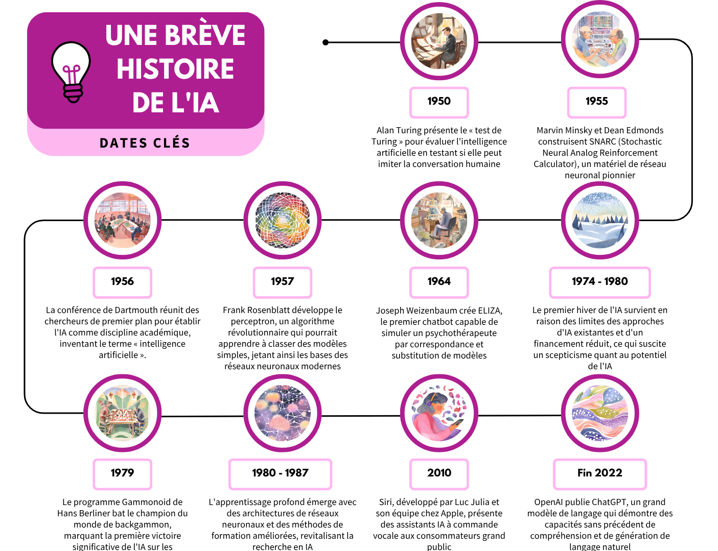 - 1956 : La conférence de Dartmouth réunit des chercheurs de premier plan pour établir l'IA comme discipline académique, inventant le terme « intelligence artificielle ».