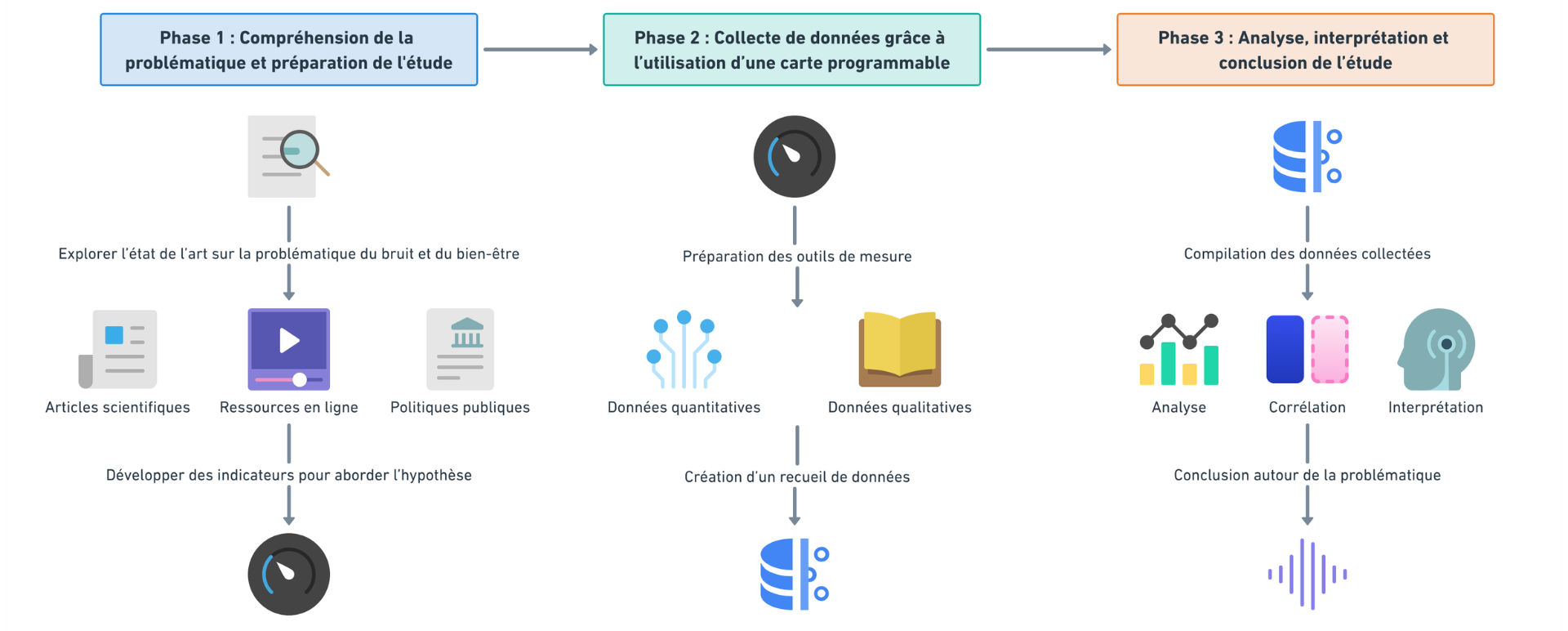 - Phase 1 — Exploration des concepts clés et formulation de la question de recherche : les élèves explorent les principes fondamentaux du son et du bruit (ondes sonores, échelle des décibels, effets de la pollution sonore sur la santé et le bien-être). Ils formulent collectivement une question de recherche, par exemple sur les matériaux les plus efficaces pour l'isolation acoustique ou sur l'influence de l'épaisseur et de la densité. Une recherche documentaire vient consolider les bases scientifiques de leur expérimentation.