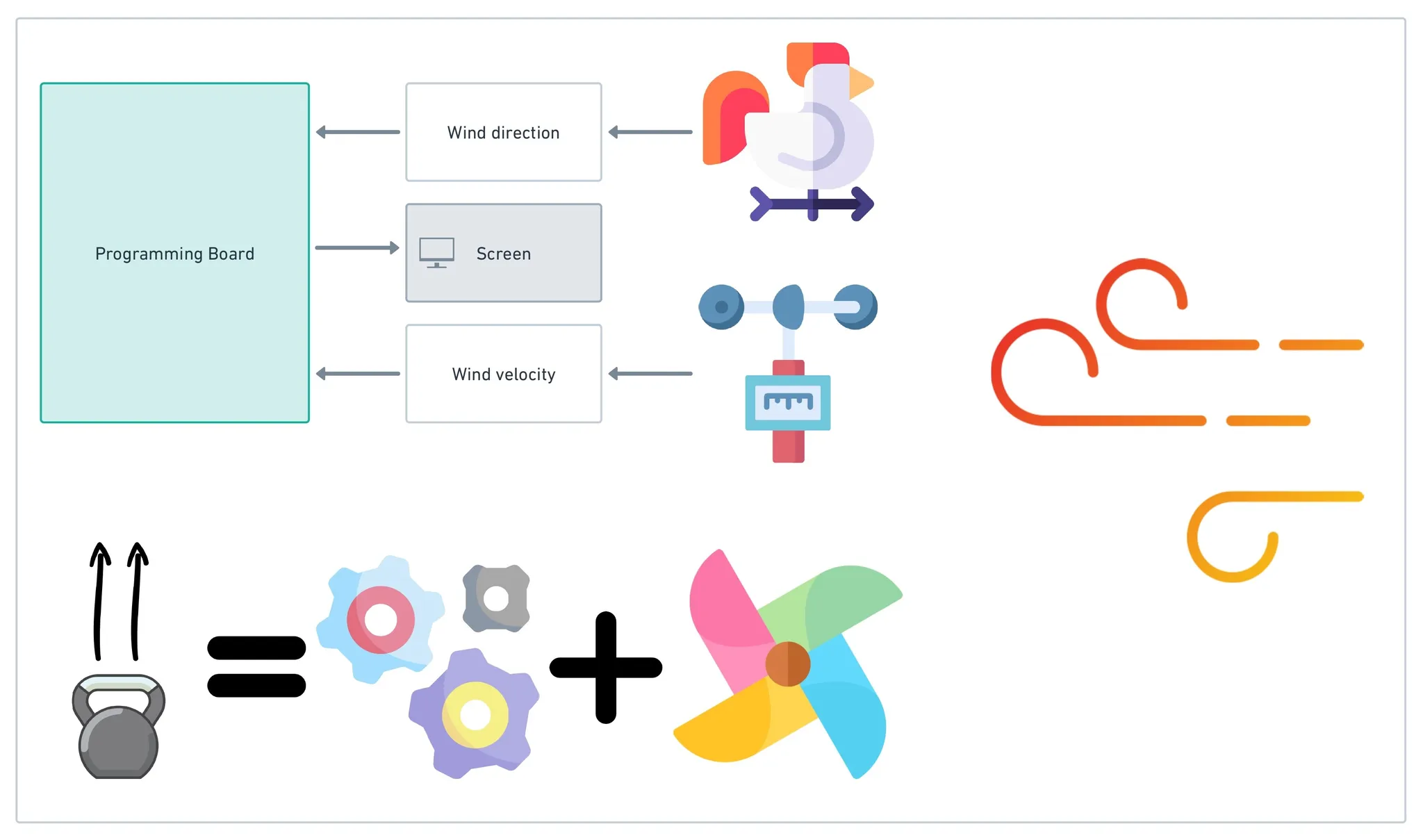 L'objectif est de construire une machine utilisant le vent (simulé par un ventilateur) pour soulever un poids de 50 g, donc à transformer l'énergie cinétique du vent en énergie mécanique. Cela amène à explorer de petites difficultés d'ingénierie : frottements, rigidité des matériaux, forces de torsion sur un axe, etc.