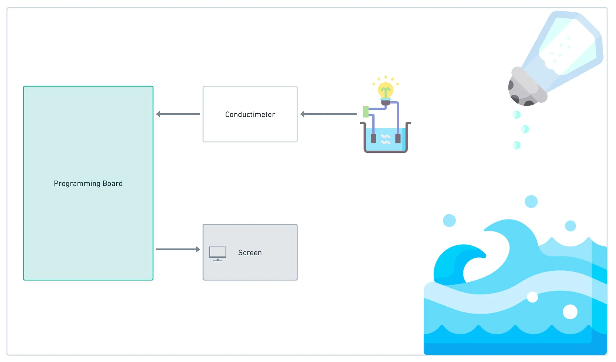 Pour avoir une mesure précise, nous allons utiliser une propriété de l'eau salée : la conductivité. La conductivité mesure la facilité avec laquelle l'électricité circule dans l'eau. Plus l'eau est salée, plus elle est conductrice du courant électrique. L'eau pure ne laisse pas passer le courant tandis que l'eau de mer est très conductrice.