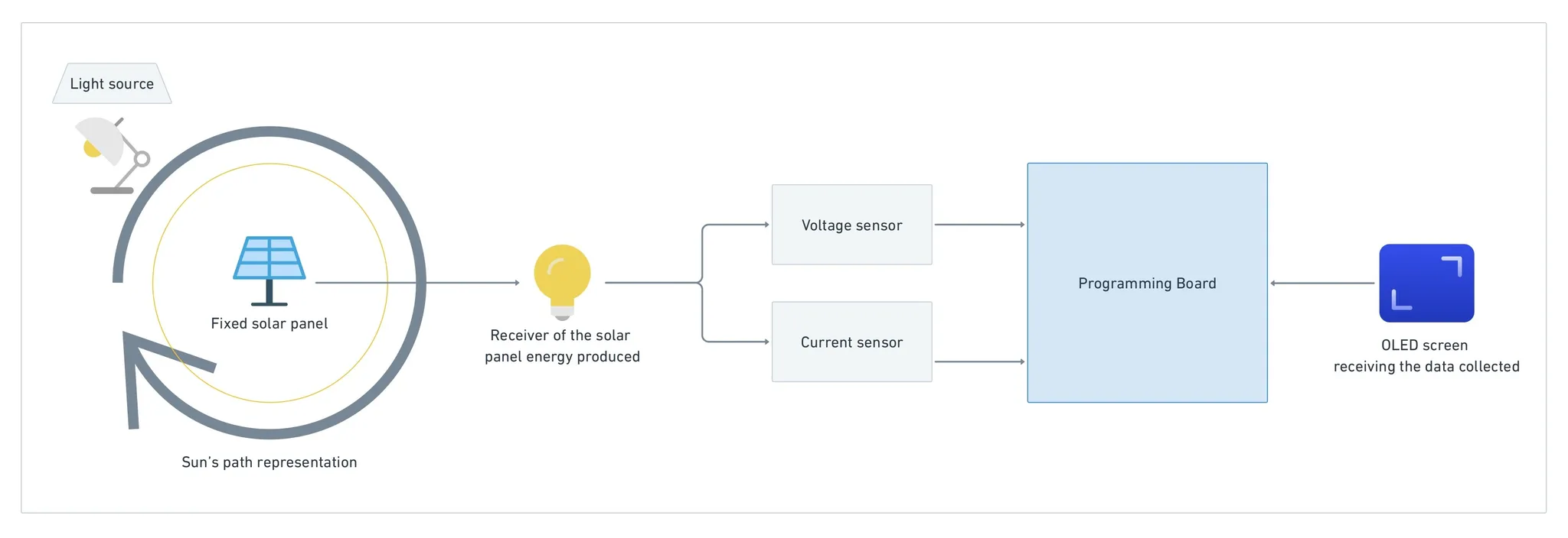 Le soleil se lève à l'est et se couche à l'ouest. Nous réaliserons une expérience avec une maquette où nous reproduirons la course du soleil. Un panneau solaire fixe et une lampe, représentant le soleil, qui suivra un arc de cercle reproduisant la course du soleil.