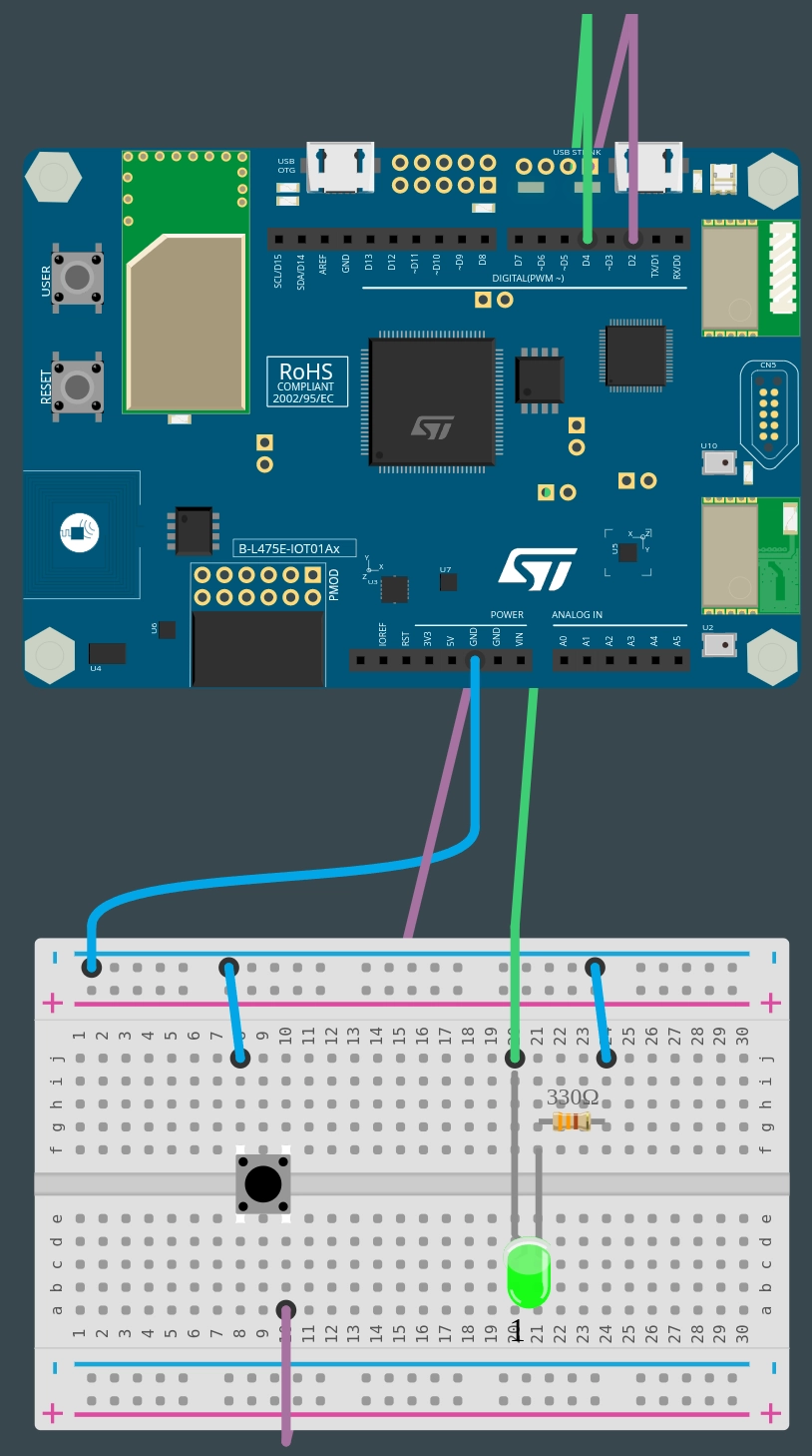 Câblage : Bouton-poussoir sur GND/D2, LED anode sur D4, cathode via résistance 330Ω sur GND.
