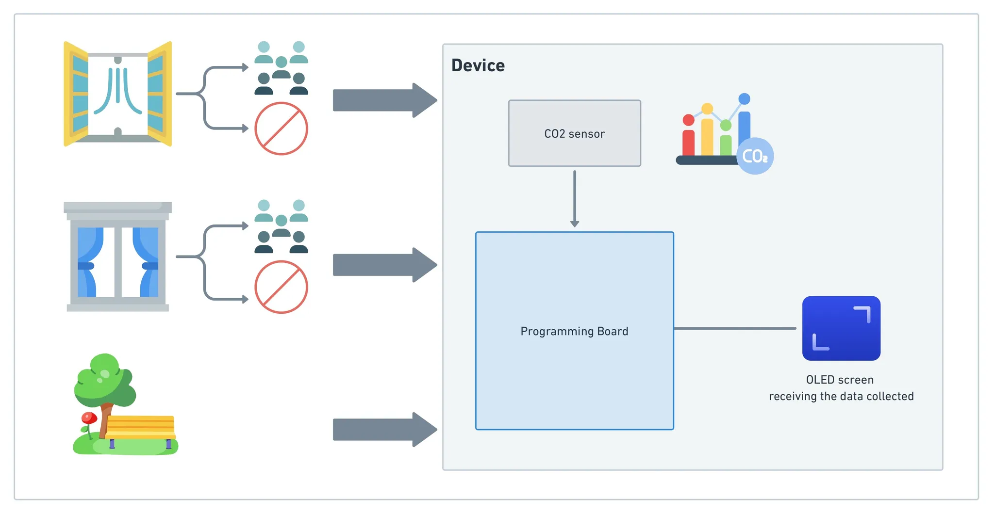 Dans ce projet, notre objectif est de mener une enquête scientifique liée à la qualité de l'air dans une pièce. Pour ce faire, nous allons fabriquer un appareil expérimental en connectant différents composants électroniques, puis le faire fonctionner à l'aide d'un programme approprié. Ensuite, nous collecterons des données et les analyserons pour mesurer la concentration de gaz CO2 dans l'air. Nous pourrons étudier et comparer les résultats obtenus dans différentes conditions, comme dans le cas d'une pièce dont les fenêtres/portes sont ouvertes ou fermées, avec ou sans présence de nombreuses personnes, etc. Tout comme le font les vrais scientifiques et chercheurs ! Dans ce cas particulier, nous voulons étudier la question de recherche suivante : la qualité de l'air diminue-t-elle lorsque le nombre de personnes présentes dans une pièce augmente ? Pour répondre à cette question, nous devons construire un dispositif simple avec un tableau et un capteur pour collecter des données et les analyser.