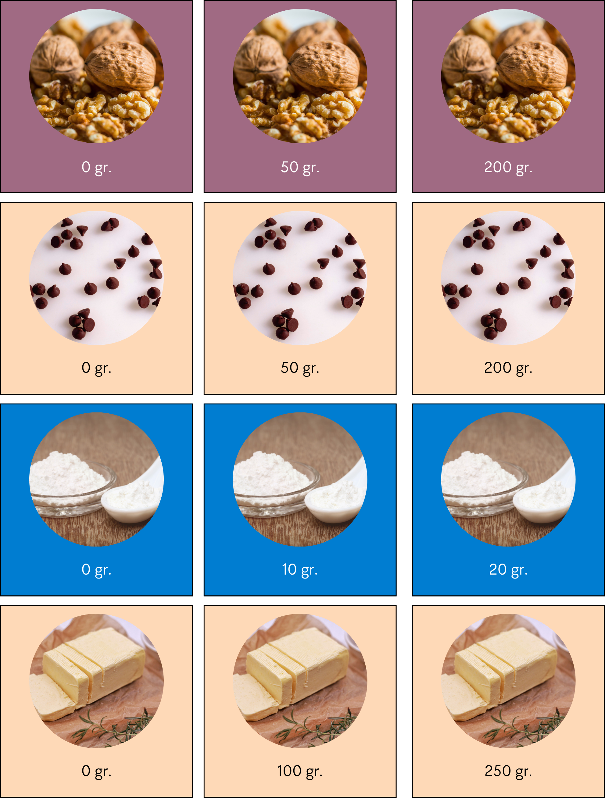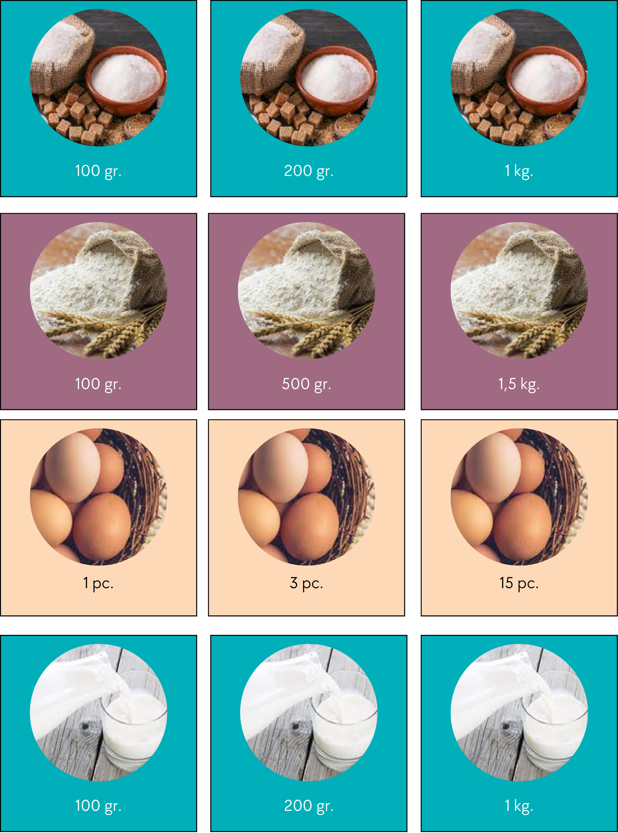 - Cartes de quantités d'ingrédients pour la répartition entre groupes (farine, sucre, beurre, oeufs, pépites de chocolat, etc.)