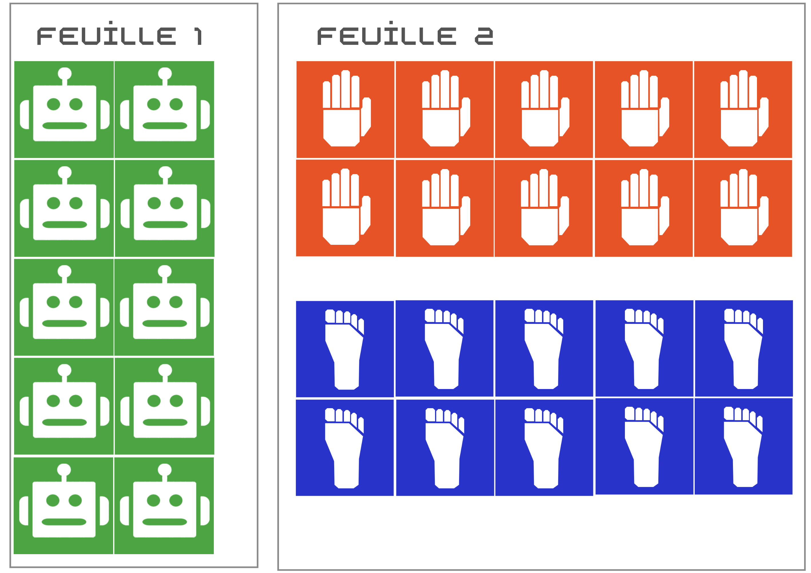 - Selon le niveau de difficulté (décrit ci-dessous), l'enseignant peut utiliser les pions de la feuille 1 ou de la feuille 2.