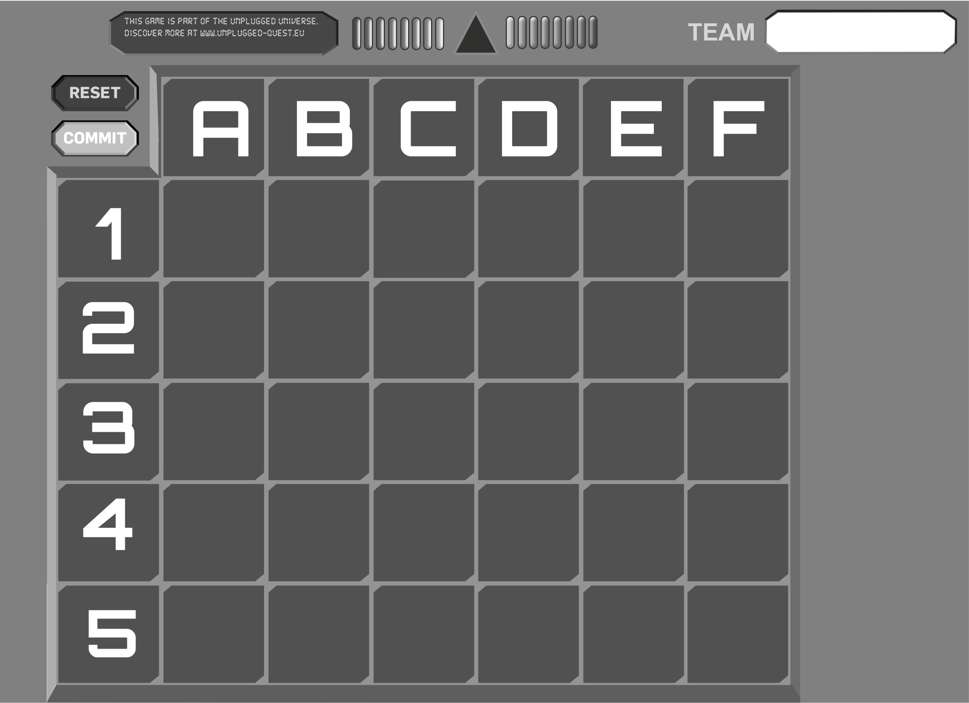 En utilisant les pions robots (verts), le meneur de jeu doit placer les robots sur les bonnes cases. Le meneur de jeu donne des ordres aux robots jusqu'à ce que le temps soit écoulé. Le jeu s'arrête lorsque l'un des meneurs de jeu a terminé la figure et appelle l'enseignant. Dans cet exemple, le jeu se déroule avec six robots. Pour gagner le jeu, le meneur doit reproduire cette figure avec les vrais robots (ses camarades de classe). Les robots doivent se tenir sur A1, D1, F2, C3, B5 et E5.