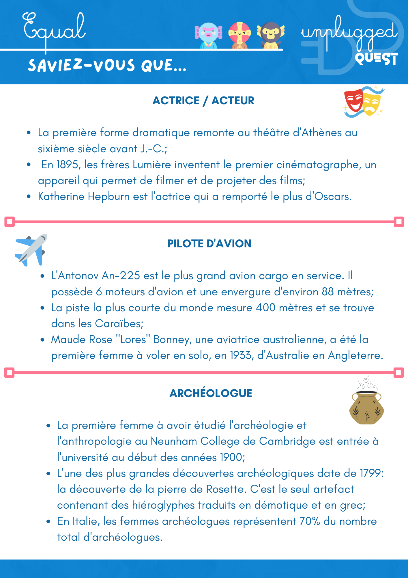 Les personnages et les métiers présentés appartiennent aux temps passés et présents, à des cultures anciennes, lointaines ou proches. Les questions sont pensées pour stimuler la curiosité des élèves. Ils découvrent des faits, et des anecdotes inédites sur le rôle que certaines femmes et hommes ont pu jouer dans notre histoire, la politique, les sciences et les sports.