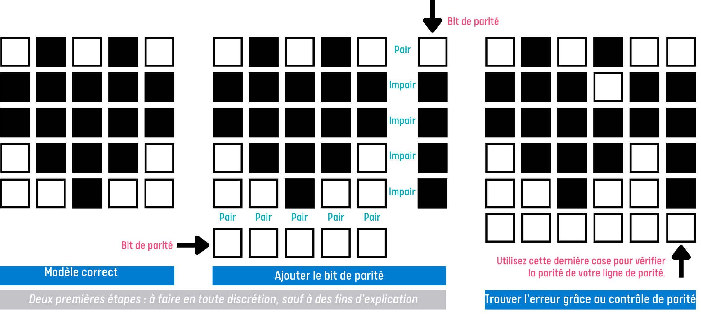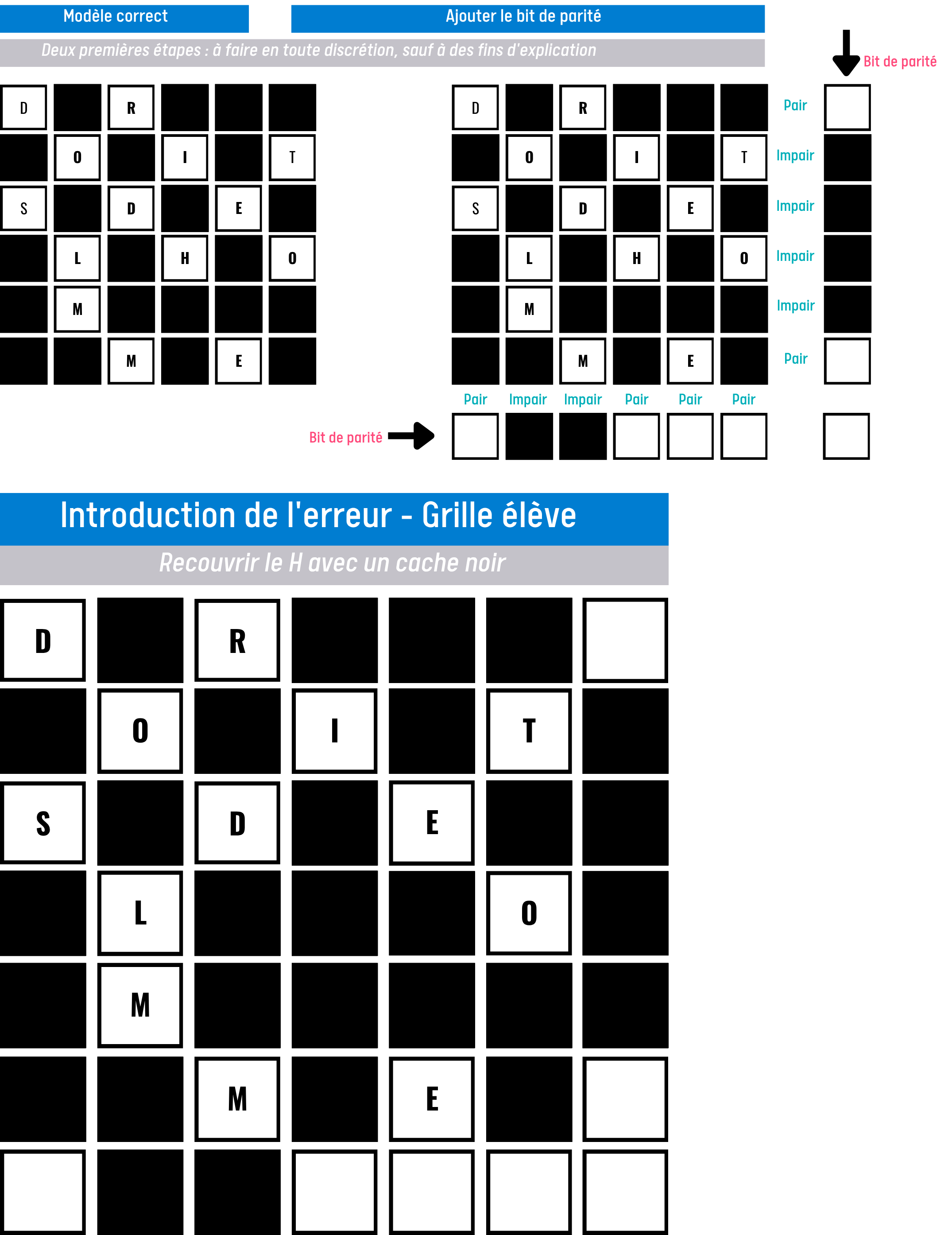 Pour comprendre la détection d'erreurs, nous utiliserons des grilles composées de carrés blancs (remplis de lettres), sur lesquels on dessine un motif en utilisant des cartes noires. Une fois le motif défini, on ajoute secrètement une dernière colonne et une dernière ligne faisant office de bit de parité. Puis on introduit une erreur dans la grille. Les élèves doivent retrouver, en effectuant un contrôle de parité, quelle carte a été déplacée, ajoutée ou retirée.