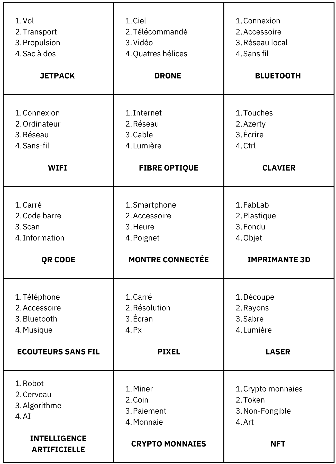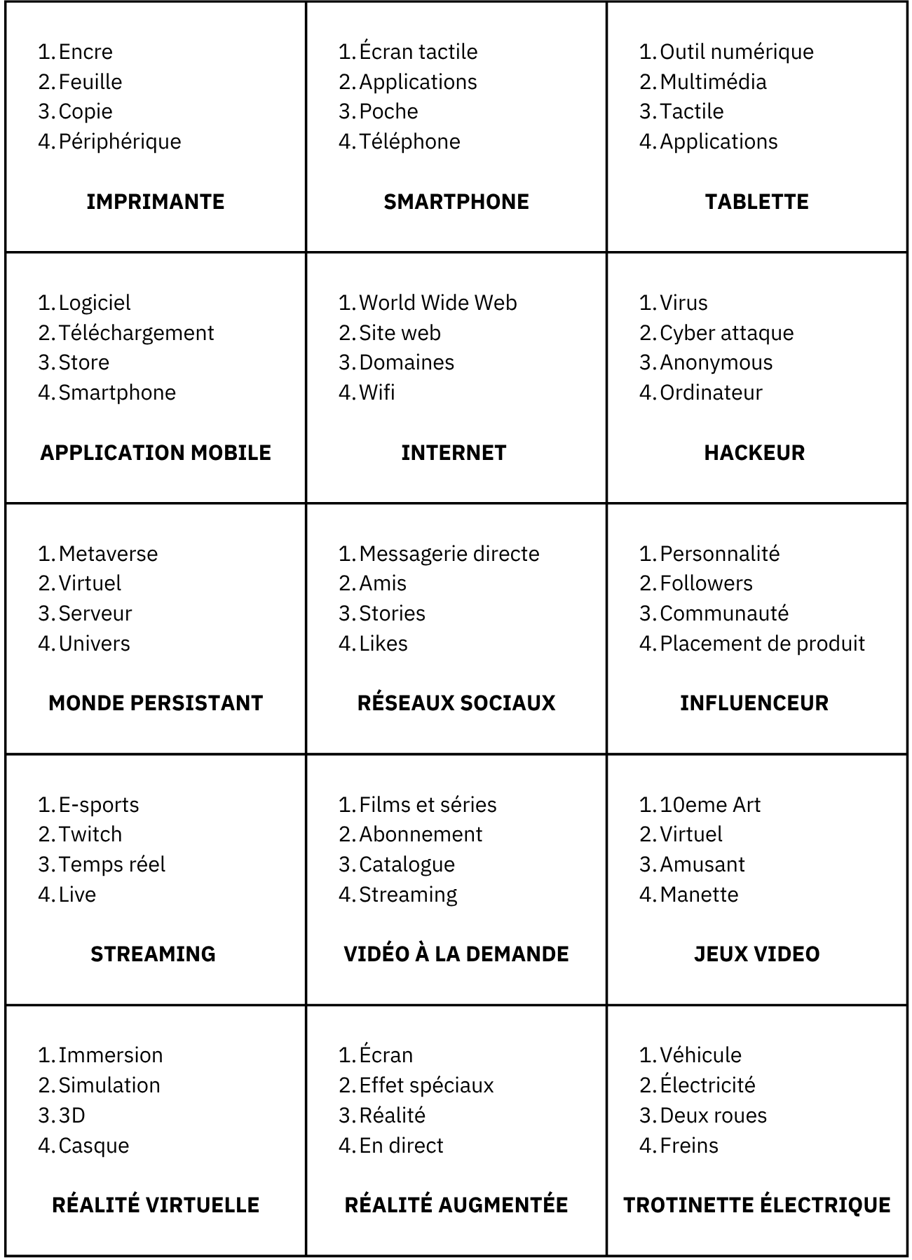 - 30 cartes concepts (chacune avec 4 indices progressifs)